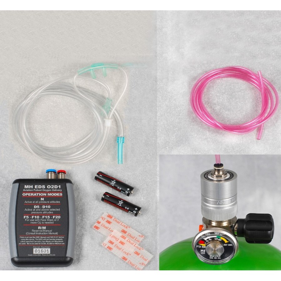 If you already own a cylinder, the O2D1-2G with our one-place XCR CGA-540 regulator (4mm) can get you flying longer and higher. The kit includes the O2D1-2G unit, Regulator, 2 EDS cannulas (one flare tip, 1 regular), 1 face mask, 2 AA batteries, tote bag and User Manual.