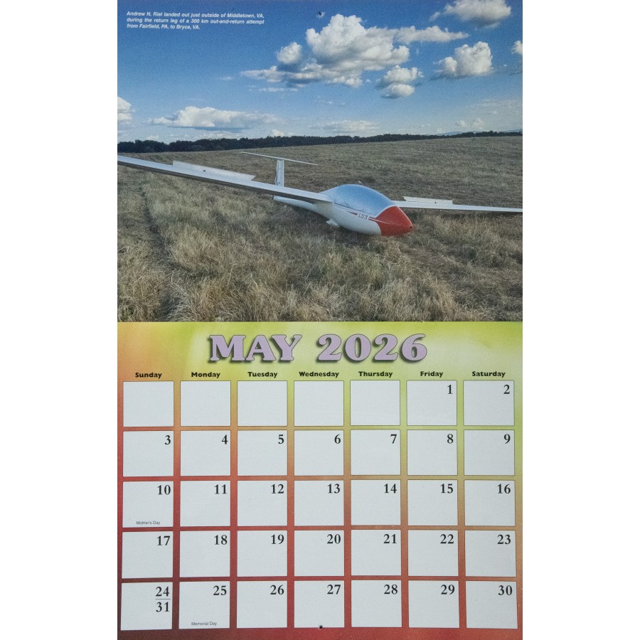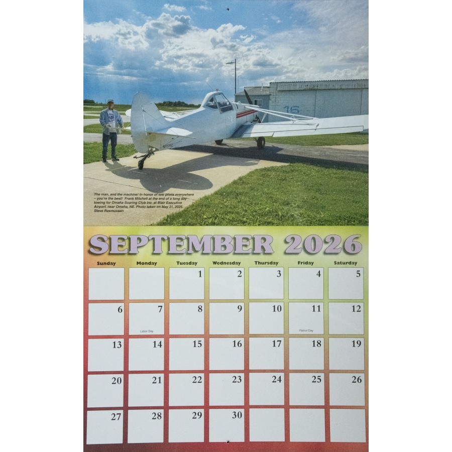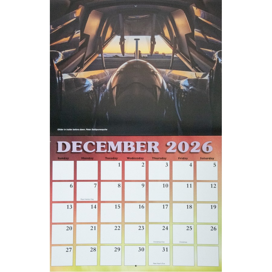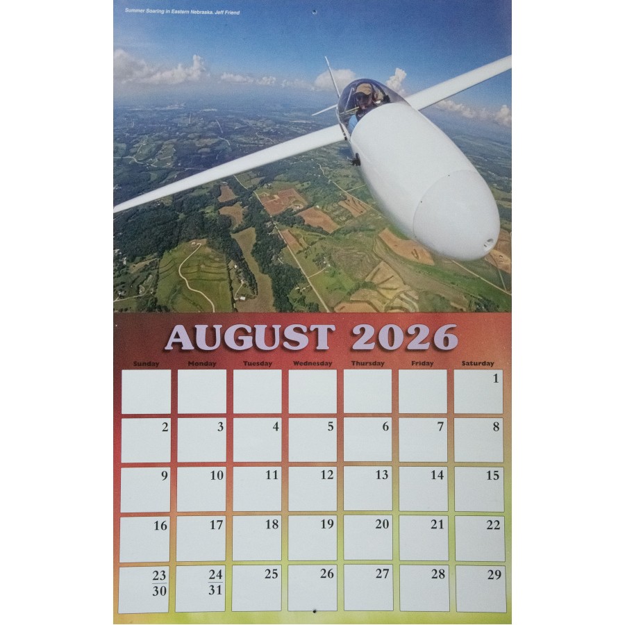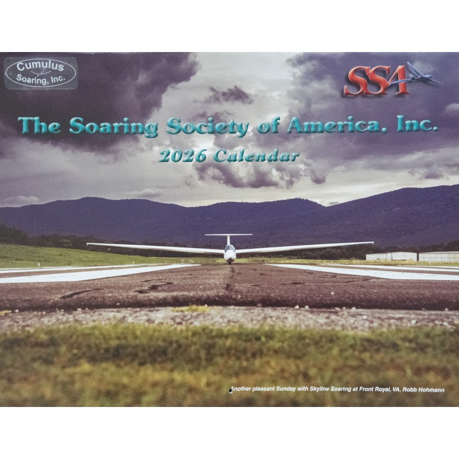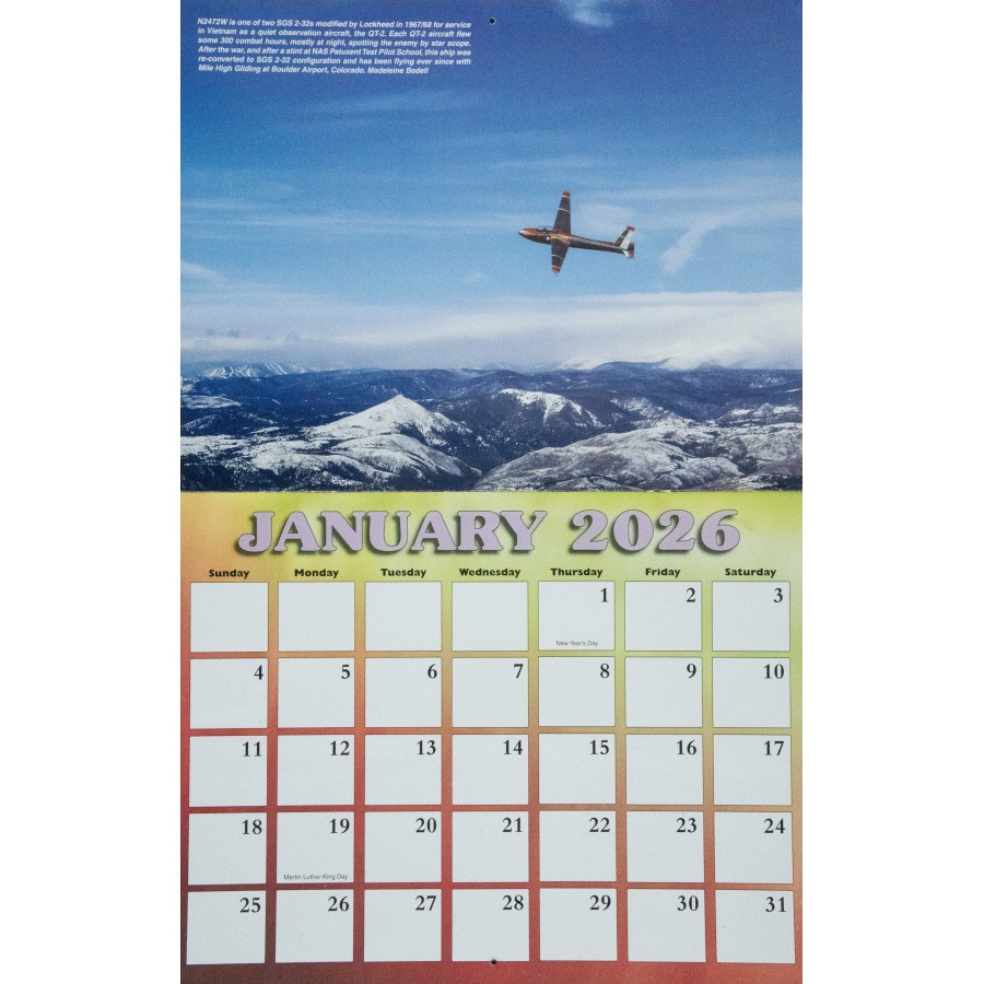 The 2026 SSA Calendar is custom-designed with spectacular full color photos of sailplanes from photographers spanning the globe. Monthly grids feature plenty of space to write notes, make appointments and keep special occasions. Makes a great gift!