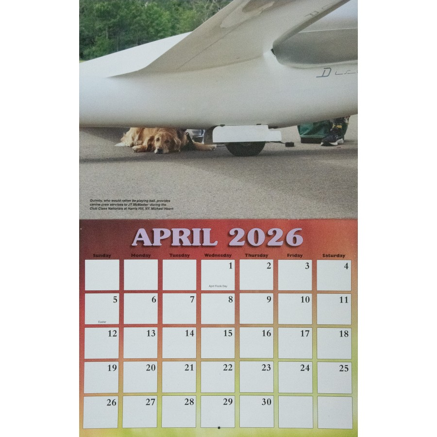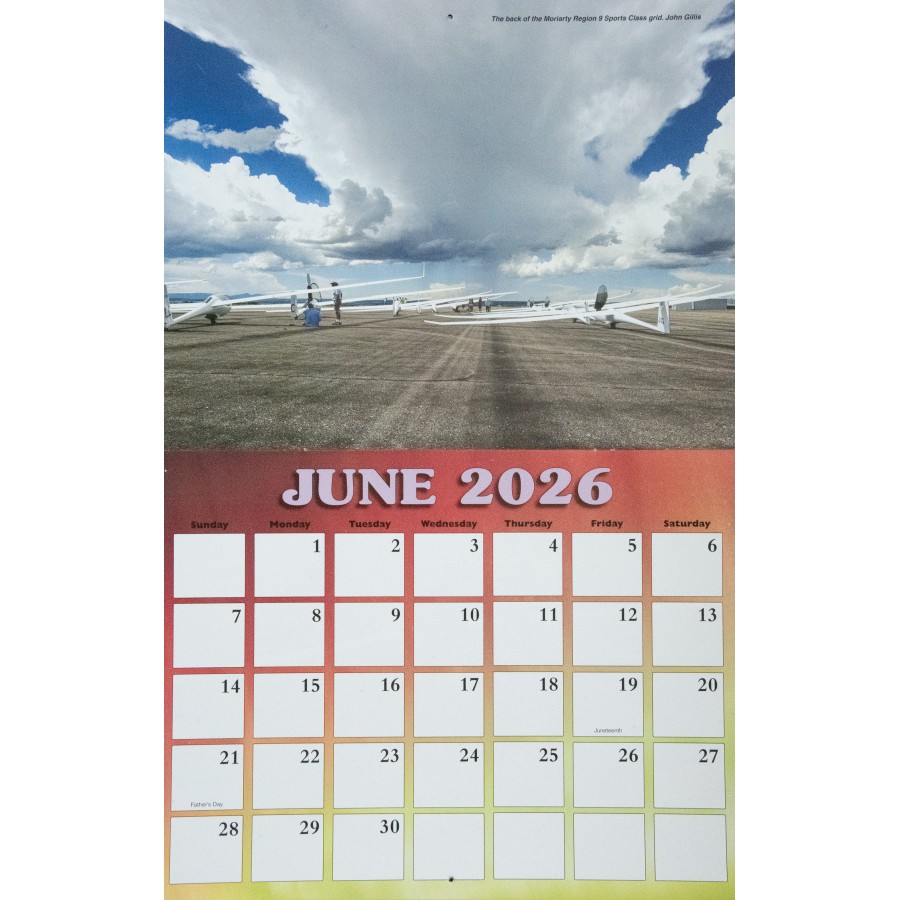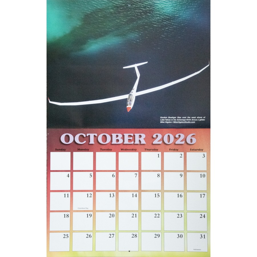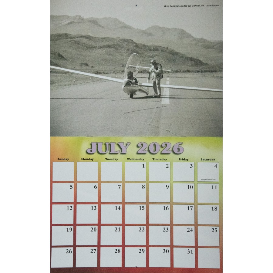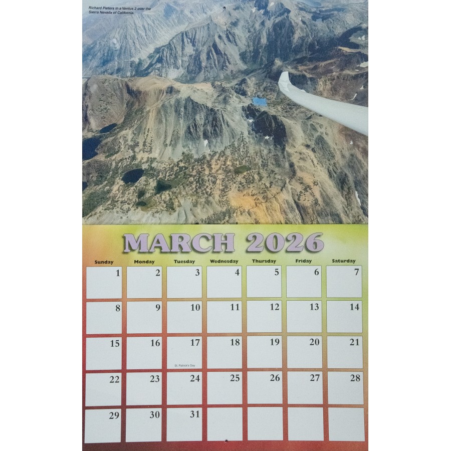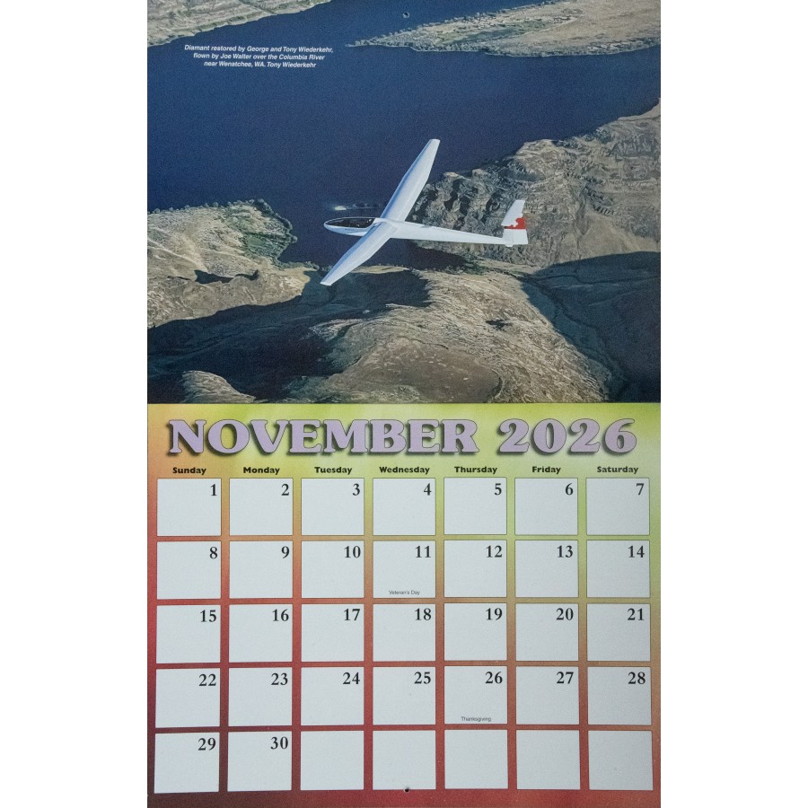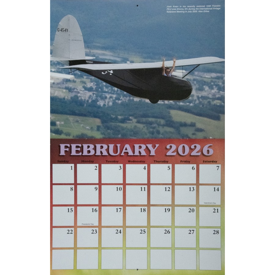 The 2026 SSA Calendar is custom-designed with spectacular full color photos of sailplanes from photographers spanning the globe. Monthly grids feature plenty of space to write notes, make appointments and keep special occasions. Makes a great gift!